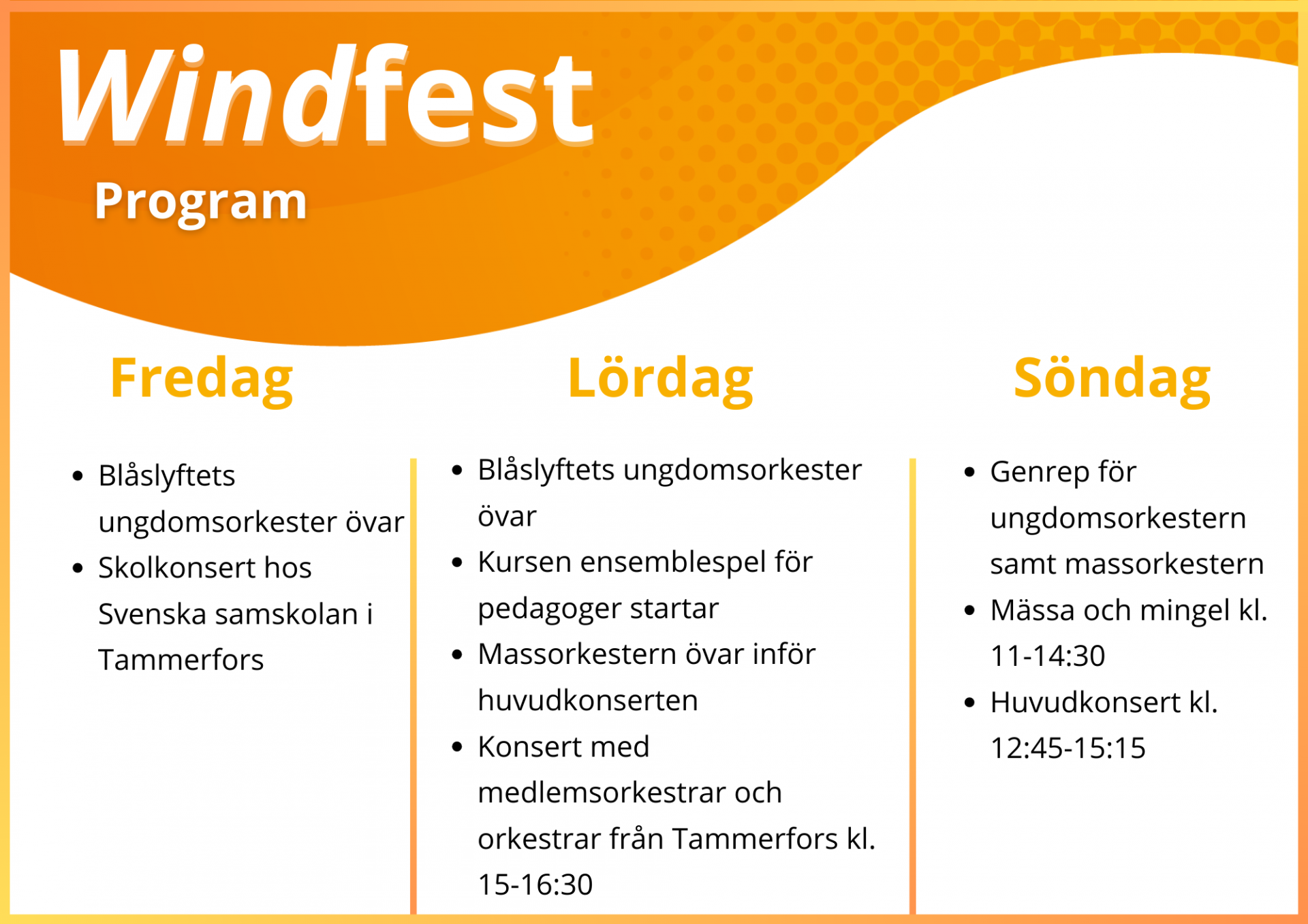 Här kan du se ramplanen för Windfest 2024. Merparten av programmet hålls i Tammerfors konservatorium, F.E. Sillanpään katu 9.